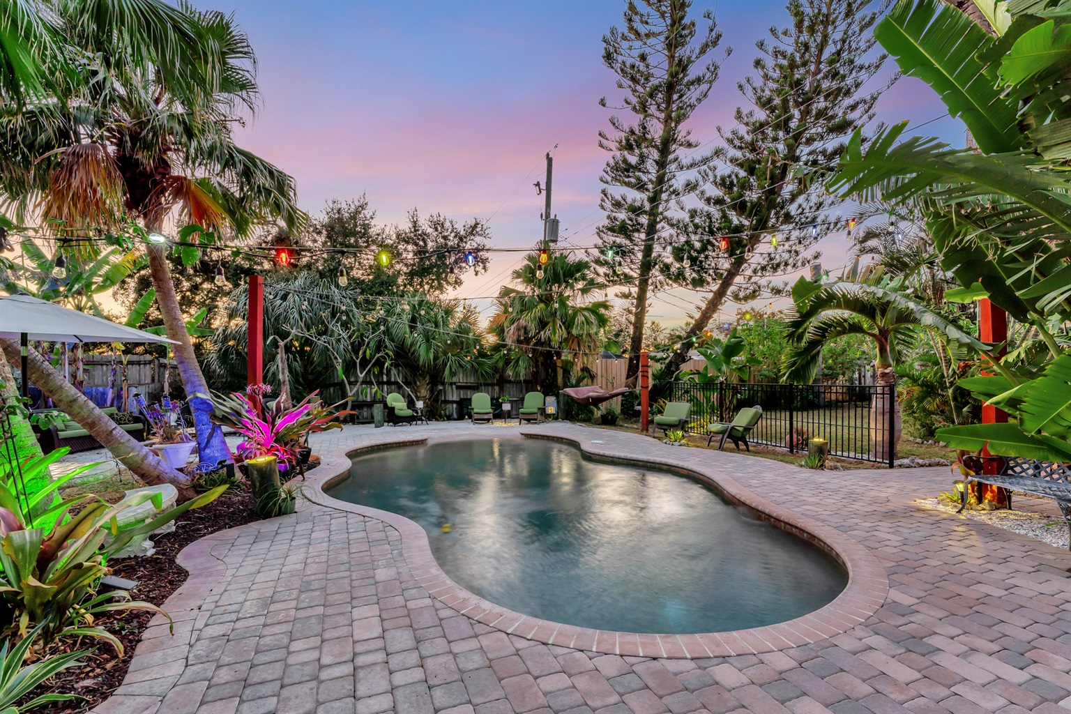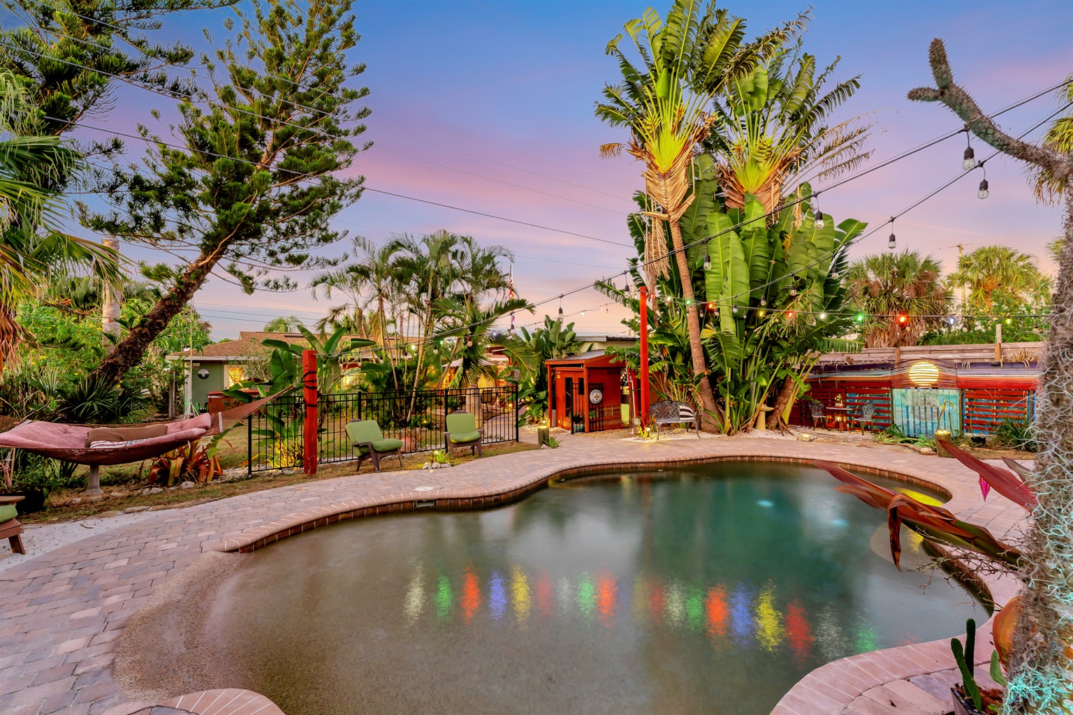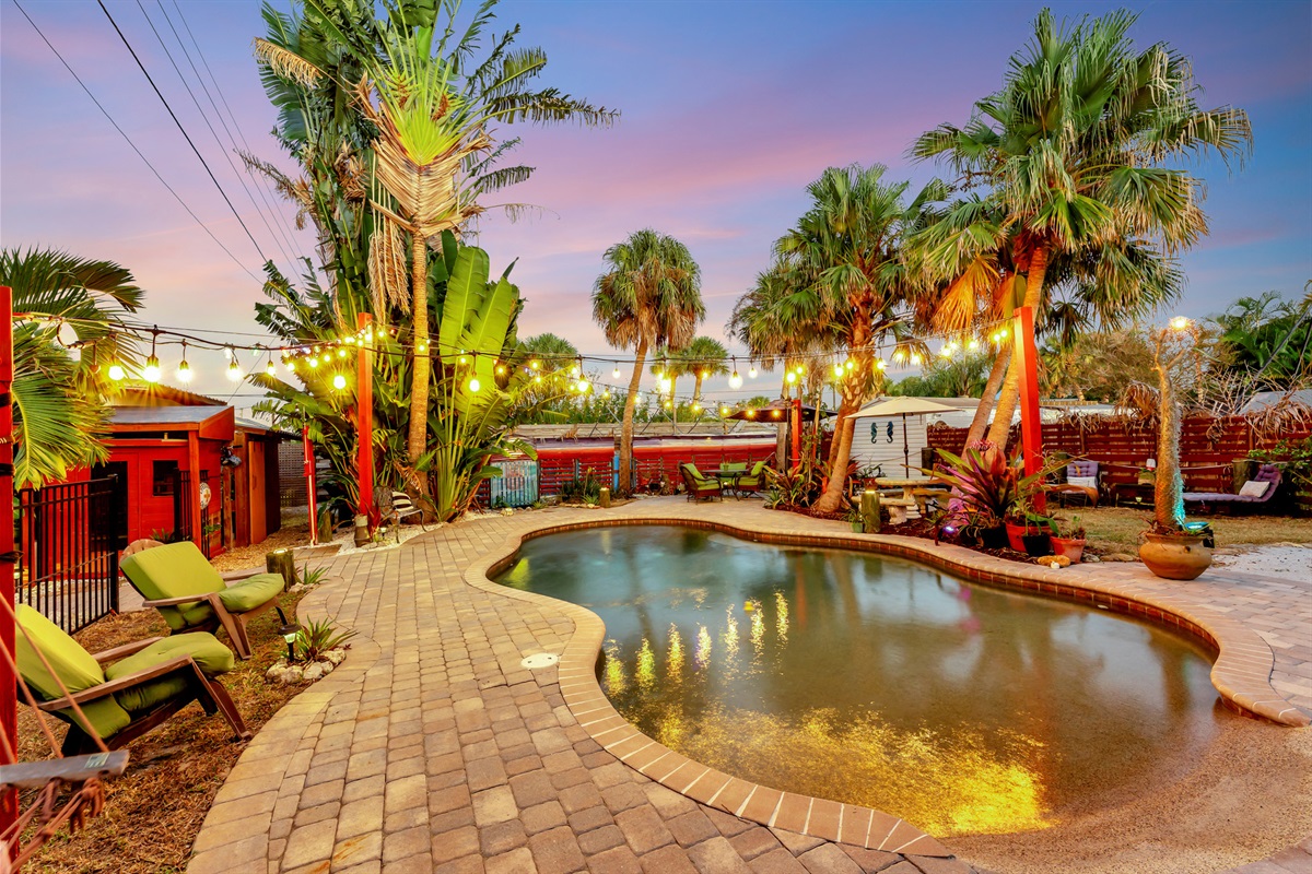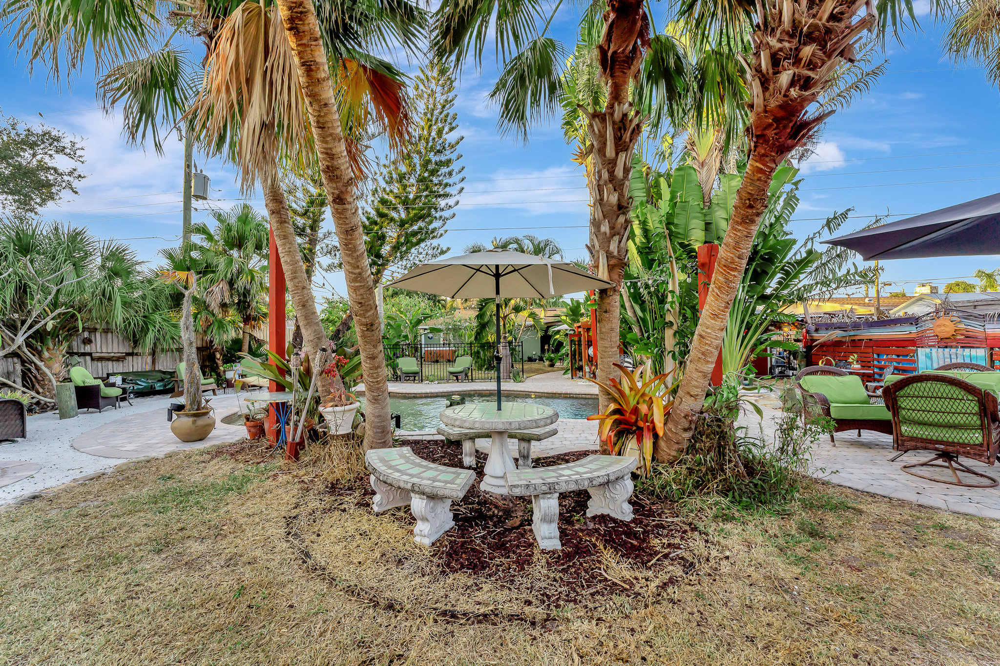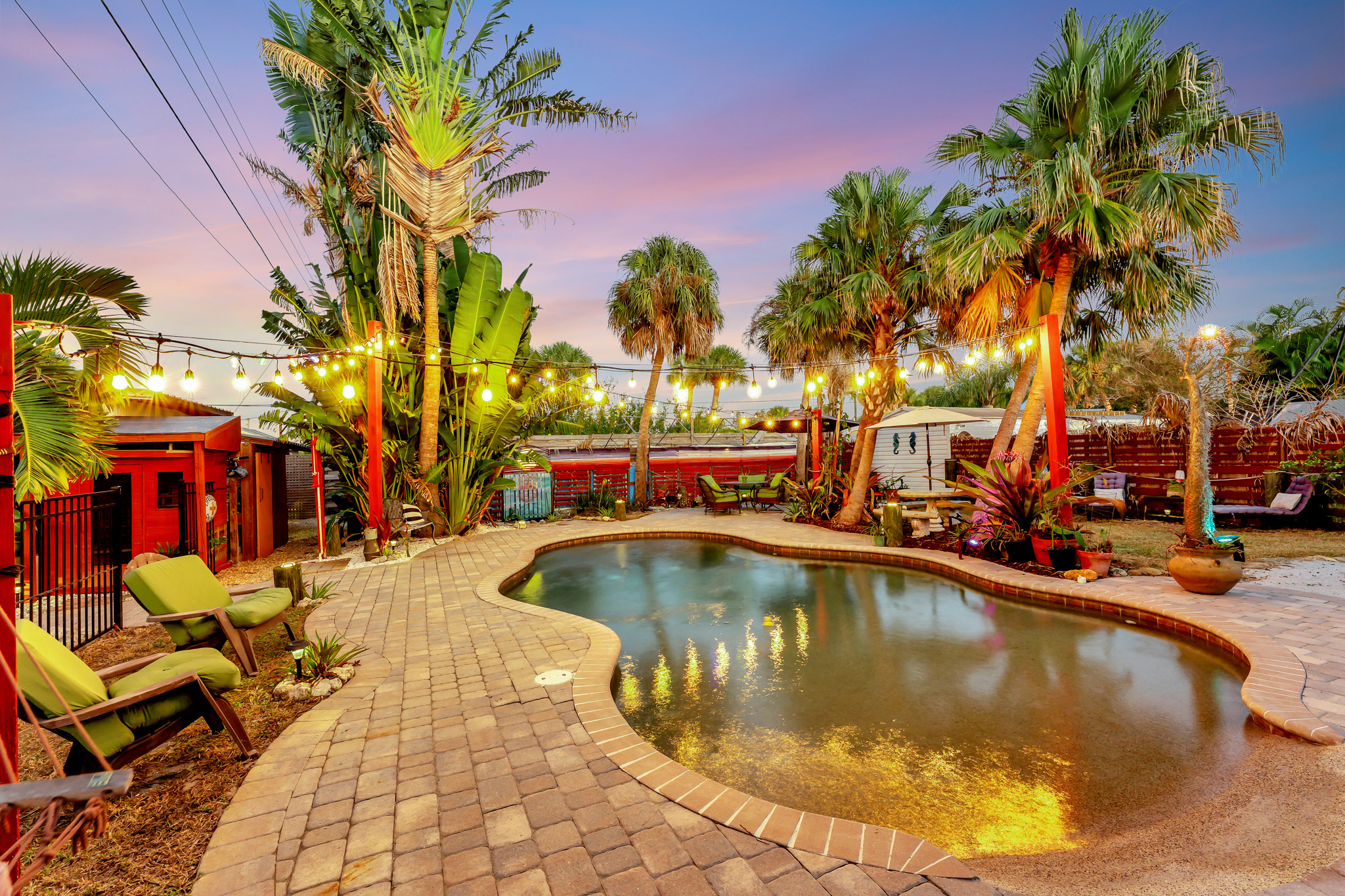 2 Bedrooms • 2 Bathrooms 2 Baths • Sleeps 4-5Discover South Venice's secret micro-resort coastal getaway! 🌴✨ This plush, pet-friendly, and peaceful (2-bedroom) home (~3-lot estate) offers a heated lagoon walk-in pool amidst pristine tropical surroundings at a prime location—just half a mile to the local South Venice Beach Ferry, which leads to the exclusive private beach on Manasota Key (accessible only to locals and Fennario Resort's guests—i.e., you).